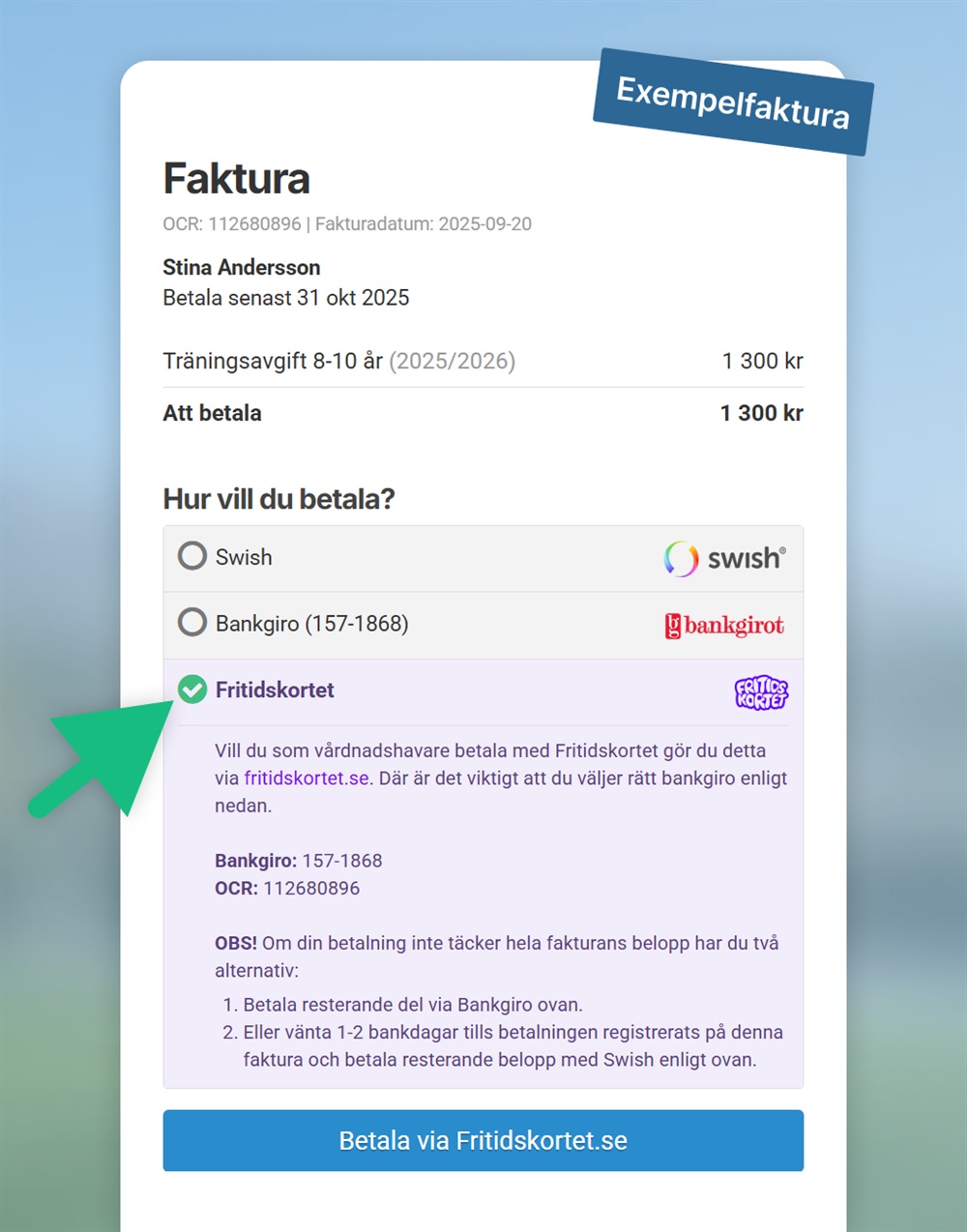 Katrineholms Friidrott har nu anmält sig till Fritidskortet. Det innebär att du kan använda Fritidskortet för att betala medlemsavgiften. För att betala med Fritidskortet är det viktigt att du följer instruktionerna enligt bilden.